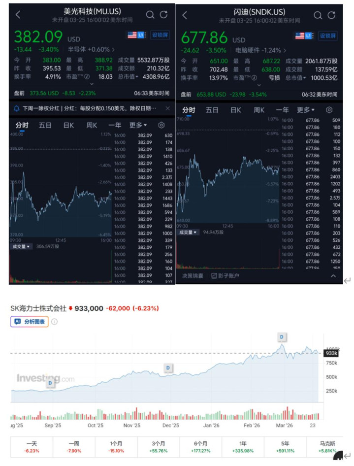 美光、闪迪、SK海力士股价图 / 三家企业的股价走势及收盘跌幅数据